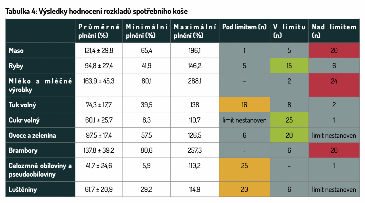 Nevíme, jak na SZÚ definují pojem většina, ale při sledování všech komodit spotřebního koše nesplnilo normu alespoň pro jednu komoditu (obiloviny a pseudoobiloviny) 21 jídelen z 26 (80,77 %) a v případě dalších komodit je to podobné – v plnění mléka nesplnilo 14 jídelen z 26 (53,85 %), u luštěnin 12 jídelen (46,15 %) a tak dále.